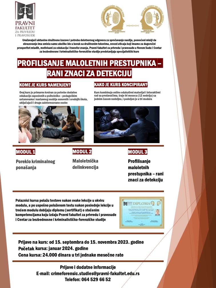 Uvažavajući aktuelne društvene izazove i potrebu delotvornog odgovora za sprečavanje nasilja, posvećeni misiji da obrazovanje ima smisla samo ukoliko ide u korak sa društvenim tokovima, svesni uticaja koji imamo za dugoročni prosperitet mladih, motivisani za edukaciju i transfer znanja, Pravni fakultet za privredu i pravosuđe u Novom Sadu i Centar za bezbednosne i kriminalističko-forenzičke studije predstavljaju specijalistički kurs „Profilisanje maloletnih prestupnika – rani znaci za detekciju“.